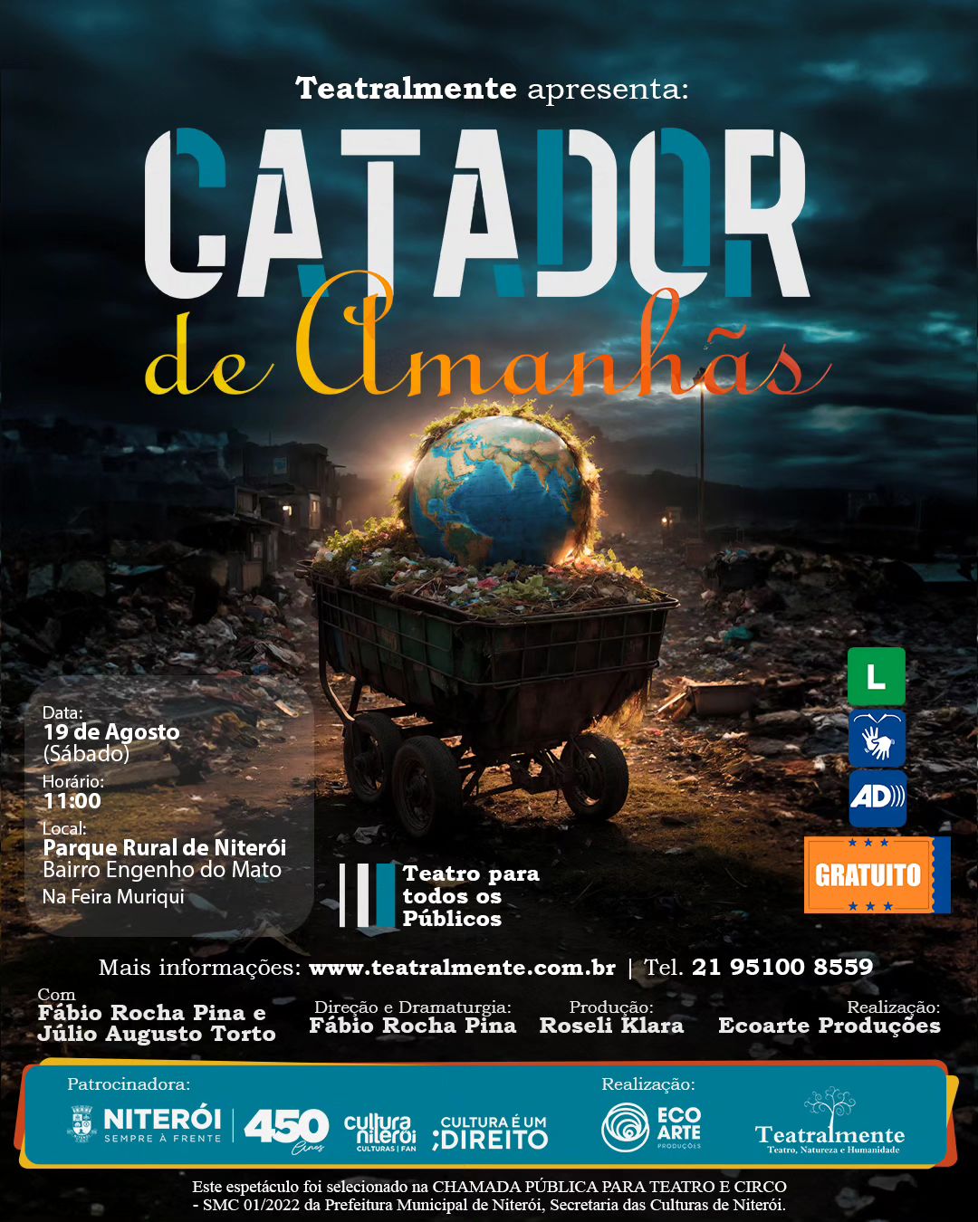 O Teatralmente apresentou neste sábado, 19 de agosto, o espetáculo “Catador de Amanhãs” no Parque Rural de Niterói, Bairro do Engenho do Mato, com entrada gratuita. Teatro para todos os públicos com tradução em LIBRAS – Língua Brasileira de Sinais e Audiodescrição simultânea ao vivo.