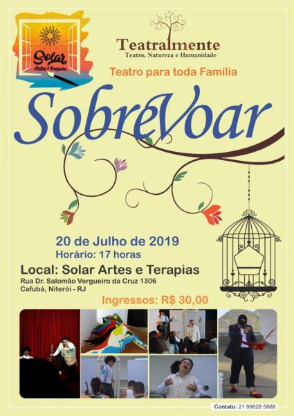 “SobreVoar” é um espetáculo encantador para crianças, jovens e adultos. Em cena o encontro de um menino que vive trancado em uma gaiola, por achar perigoso o mundo aqui fora, e um viajante contador de histórias apaixonado pelas aves.É sobre aves, liberdade, meio ambiente, natureza, amizade, mas sem pieguismos. Fazendo do espetáculo uma ótima ferramenta de educação, mesmo sem a pretensão de ser educativo.Um “Teatro de Encontros” essencialmente artesanal, humano, mas com grande fundamentação estética, filosófica, com dramaturgia poética e lúdica, além de músicas populares interpretadas ao vivo, com voz, flauta transversal, violão e muita sensibilidade.